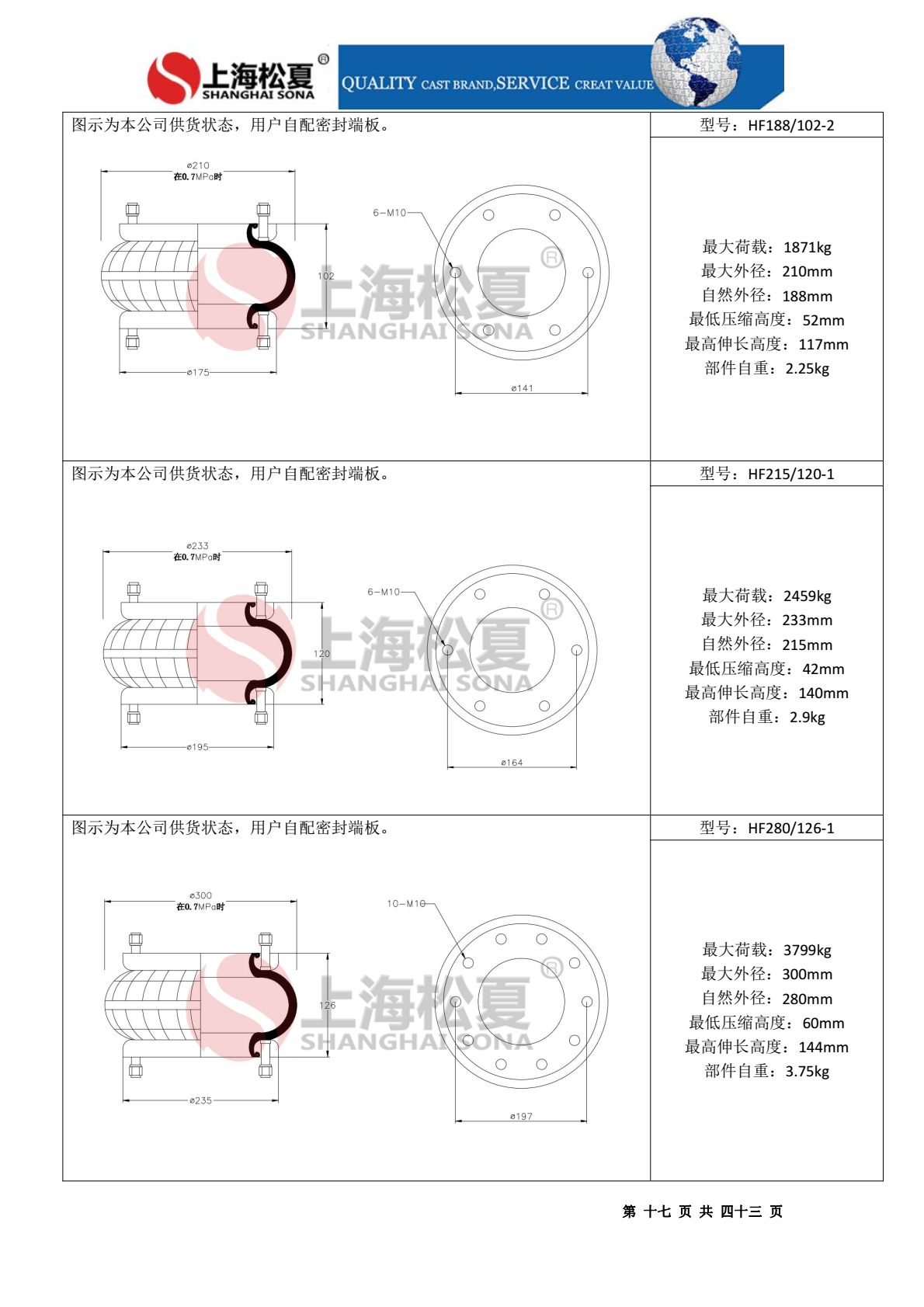 按照性能與.點又稱為:橡膠空氣沖程調(diào)節(jié)器,橡膠空氣隔振體,兩個產(chǎn)品名稱,橡膠空氣彈簧按形狀分為囊式、膜式和袖筒式三大類。按密封結構形式分為壓力自封式、輪緣夾緊式、箍環(huán)密封式和混合式四大類,橡膠空氣彈簧的載荷主要由簾線承受,簾線的層數(shù)主要由2層組成,.殊要求產(chǎn)品由4層簾線層組成。內(nèi)層橡膠主要是起密封作用,外層橡膠除了起密封作用外,還起保護作用。
